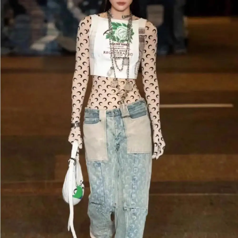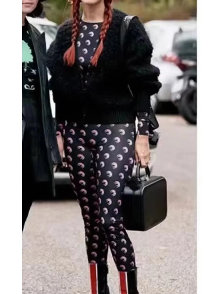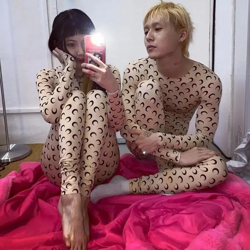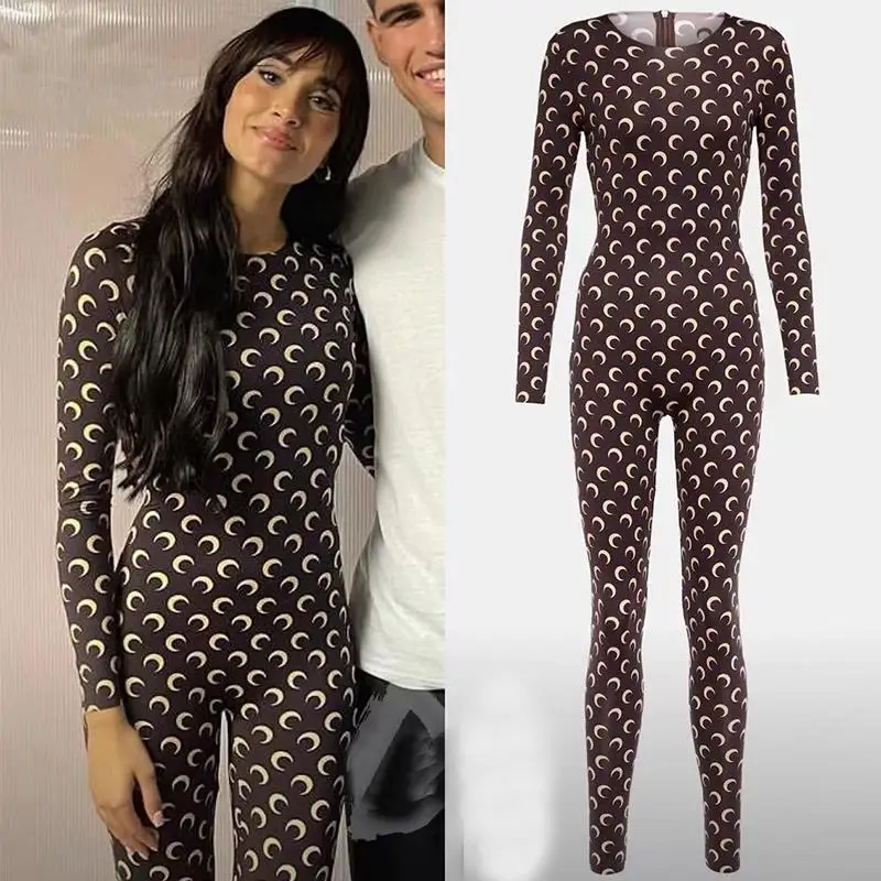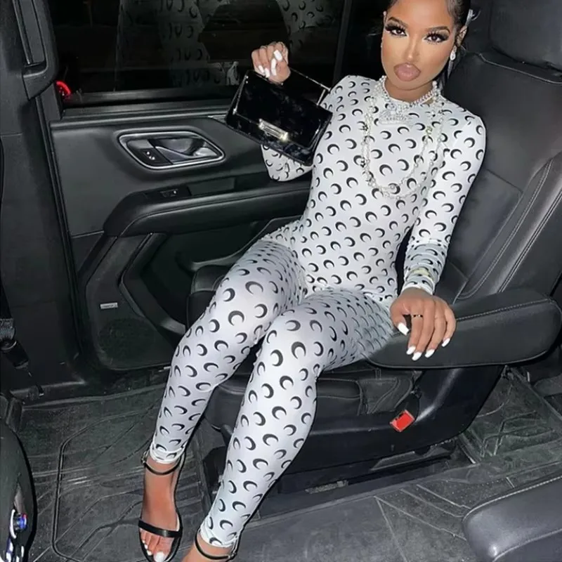 Women Jumpsuit Y2K Streetwear Moon Print Jumpsuit Elastic Long Sleeve Round Neck Autumn Sexy Fashion Bodysuit
